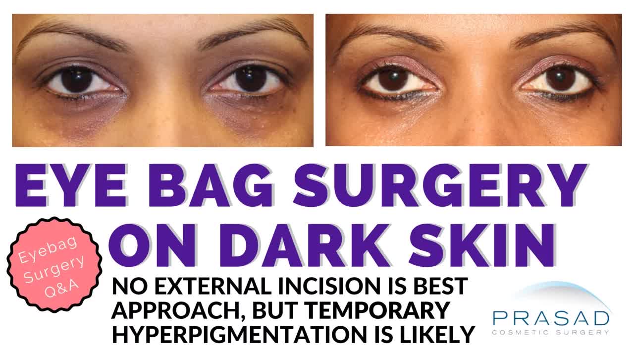 The best eye bag surgery approach for all skin types, and most notably for darker skin is a transconjunctival blepharoplasty. The transconjunctival approach leaves no external incision, so there there is no possibility of a scar. The transconjunctival approach is done from the inside of the eyelid, where fat is excised and sculpted to eliminate the constantly present eye bags.